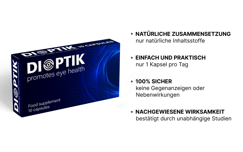Dioptik zeichnet sich gegenüber vergleichbaren Produkten durch die Kombination aus 100 % natürlicher Zusammensetzung und hoher Wirksamkeit aus. Sorgfältig ausgewählte Inhaltsstoffe wirken synergistisch und haben eine umfassend gesundheitsfördernde Wirkung auf die Sehorgane. Dies unterstützt die schnelle Wiederherstellung der Sehfunktion und die Vorbeugung von Katarakt, Glaukom, Kurzsichtigkeit und anderen Erkrankungen.